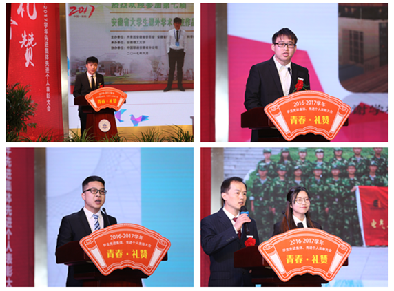 表彰会上,保研北大、乐学善思学生典型、能源与环境学院学生高辉辉,克服困难、励志成才学生典型、化学与化工学院学生叶志,暖寻阿里、创新创业学生典型、机械工程学院学生应万明分别代表获奖学生发言;团结奋进的校十佳班级典型、电气与信息工程学院自Z141班班主任方炜、学生陈倩倩代表先进集体讲述先进班级的创建历程。他们分享了各自成长的故事和成功的经验,汇报了各自在学习、工作、科技创新和班级建设等方面取得的成绩。表彰大会前,全体获奖学生代表在会场外的签名墙上签名留念。